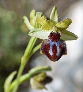 Am nächsten Tag kehren wir zurück, um uns die Gegend genauer anzuschauen. Vorher machen wir Halt an einem Opuntienhain in der Nähe der Stadt Manfredonia, in dessen Lichtungen Ophrys lutea und Serapias parviflora wachsen. Die dort erhofft Siponto-Ragwurz (Ophrys sipontensis) aber finden wir nicht. Vermutlich ist sie in der Ebene schon verblüht. Uns bleibt die Hoffnung auf eine Begegnung in größerer Höhe. Zurück am Steinbruch lernen wir zunächst den Unterschied kennen zwischen Ophrys incubacea und der Gargano-Ragwurz (Ophrys garganica): Die Lippe von incubacea ist länglicher und hat ausgeprägte Höcker, garganica ist zudem an den breiten, an den Rändern gewellten Petalen zu erkennen und hat mitunter einen gelblichen Lippenrand. Im zweiten Kesselgrund des Steinbruchs entdecken wir Ophrys bertolonii mit ihrer charakteristischen Blüte. Benannt ist sie nach dem italienischen Botaniker Antonio Bertoloni (1775 - 1869). der eine zehnbändige "Flora italica" veröffentlichte.