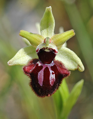Nach der Erkundung des alten Steinbruchs gehen wir noch einmal den benachbarten Hügel hinauf. Im dichten Gras, nur bei genauem Hinschauen zu erkennen, blüht die kleine Drohnen-Ragwurz (Ophrys bombyliflora). Auch die leuchtend farbige Wespen-Ragwurz (Ophrys tenthredinifera) gibt es hier.