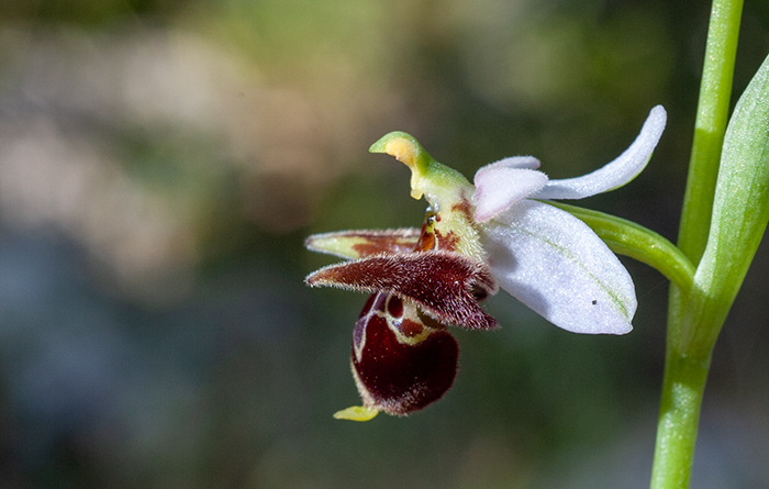 Am nächsten Tag befolgen wir diesen Rat und dann stoßen wir im lockeren Steineichenwald tatsächlich auf die Albiflora-Form dieser wunderschönen Pflanze. Auf dem weißen Grund sind noch nicht einmal die vier Punkte übrig geblieben, so dass Klaus meint, das müsse sie jetzt als "Orchis nullipunctata" ansprechen. Höchst interessant ist auch eine Hybride aus Ophrys biscutella und Ophrys tenthredinifera: Die trapezförmige Lippe ist eingebuchtet und nach oben gewölbt, wie es für tenthredinifera typisch ist. Statt des charakteristischen gelben Randes aber ist die Lippe braun wie bei biscutella. Die Form der Sepalen kommt eher nach tenthredinifera, die Petalen sind aber nicht so kurz, wie es sonst bei dieser Art ist, sondern liegen irgendwo in der Mitte zwischen beiden Arten.