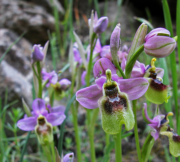Mein Ziel ist der Monte Lauro (986 m), den ich allerdings erst am dritten Tag erreiche - die Macchia der Umgebung ist so reizvoll, dass sie erst einmal in Ruhe erkundet werden will. Oberhalb eines Bachs nordwestlich von Buccheri begrüße ich am 8. April die erste Orchidee, ein Langsporniges Knabenkraut (Anacamptis morio subsp. longicornu). Auch das Milchweiße Knabenkraut (Neotinea lactea) und das Schmetterlingsknabenkraut (Anacamptis papilionacea) wachsen in einem Gebiet, das wegen zahlreicher Kalkfelsen und Unebenheiten nicht mehr als Kuhweide benutzt wird. Die Blüten von Neotinea lactea haben einen kräftigen weißen Sporn, der nach unten geboten ist. Bei Anacamptis morio subsp. longicornu ist der Sport steil nach oben gebogen.
