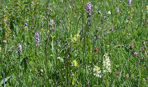 Hier blühen Gymnadenia conopsea zusammen mit Orchis mascula, Dactylorhiza fuchsii und Neottia ovata. Alle drei Wiesen stehen in sattem Grün, zeigen nicht so krasse Folgen der Trockenheit wie die Wacholderheiden. Feuchte Stellen lassen vermuten, dass hier das Grundwasser ziemlich hoch liegt. Das kommt auch Pflanzen zugute, die auf feuchte Wiesen angewiesen sind wie der Große Wiesenknopf (Sanguisorba officinalis) oder die Kuckuckslichtnelke (Lychnis flos-cuculi). Zur Begleitflora gehören auch der Große Klappertopf (Rhinanthus serotinus).